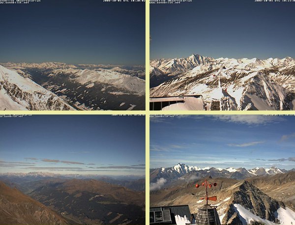 Ein Blick in das Archiv der Panorama-Webcams auf dem Sonnblick (links der Blick nach Norden, rechts der Blick nach Westen): Die oberen Bilder stammen vom 5. Oktober 2008, die unteren vom 5. Oktober 2009 (aufgenommen jeweils um 12:25 Uhr MESZ). Im Herbst 2008 endete am Sonnblick die schneearme Zeit nach der sommerlichen Schneeschmelze Mitte September und Anfang Oktober lag damals vorübergehend auch in Tallagen schon Schnee. Dagegen brachte der Herbst 2009 bis Anfang Oktober fast durchgehend warme Wetterlagen, so dass es am Sonnblick eine ungewöhnlich lange schneearme Periode gab.