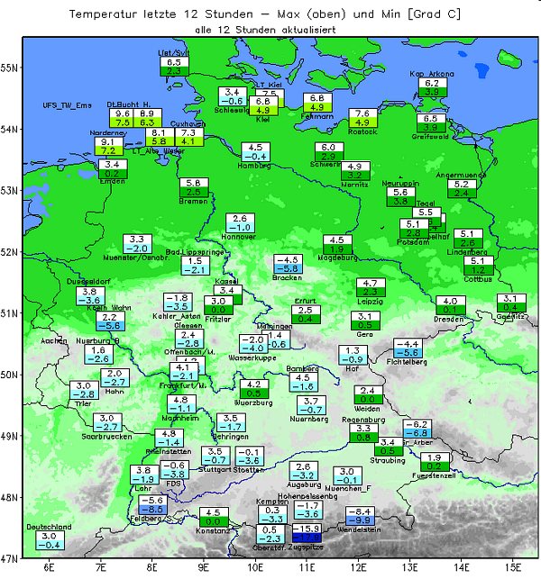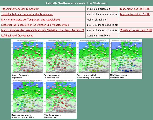![]() Die aktuellen Wetterwerte deutscher Stationen gibt es in Kartendarstellungen und auch jeweils in Listenform.