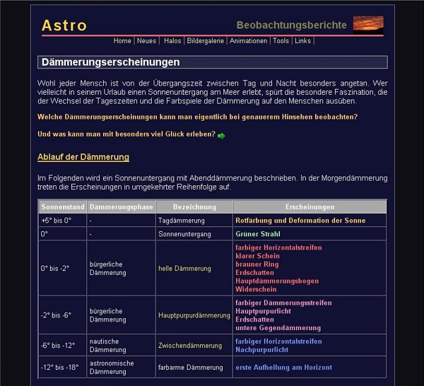 ![]() Auf den Internetseiten von Alexander Wünsche gibt es eine Zusammenstellung der Dämmerungserscheinungen, die bei günstigem Wetter am Morgen- oder Abendhimmel beobachtet werden können.