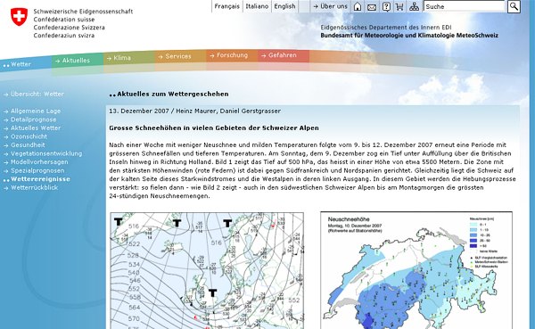 ![]() "Große Schneehöhen in vielen Gebieten der Schweizer Alpen, Vergleich der aktuellen mit den langjährigen Schneehöhen" - Der Artikel auf den Seiten von MeteoSchweiz zeigt die Entwicklung der Schneelage in der Schweiz bis zum 13. Dezember 2007.